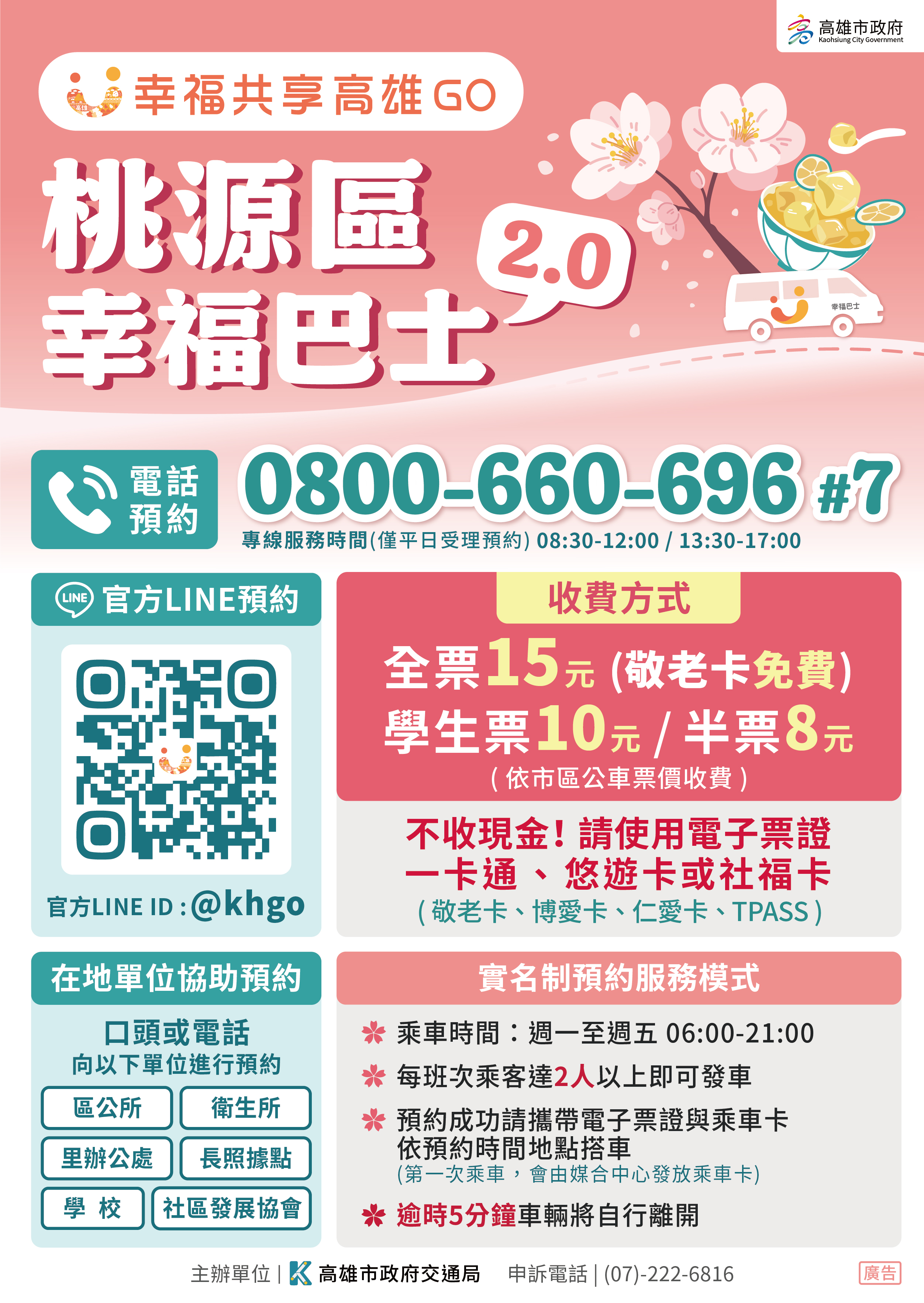 ①服務範圍 : 桃源全區往返六龜市區(義寶里、中興里、寶來里、荖濃里、新發里、六龜里、興龍里)